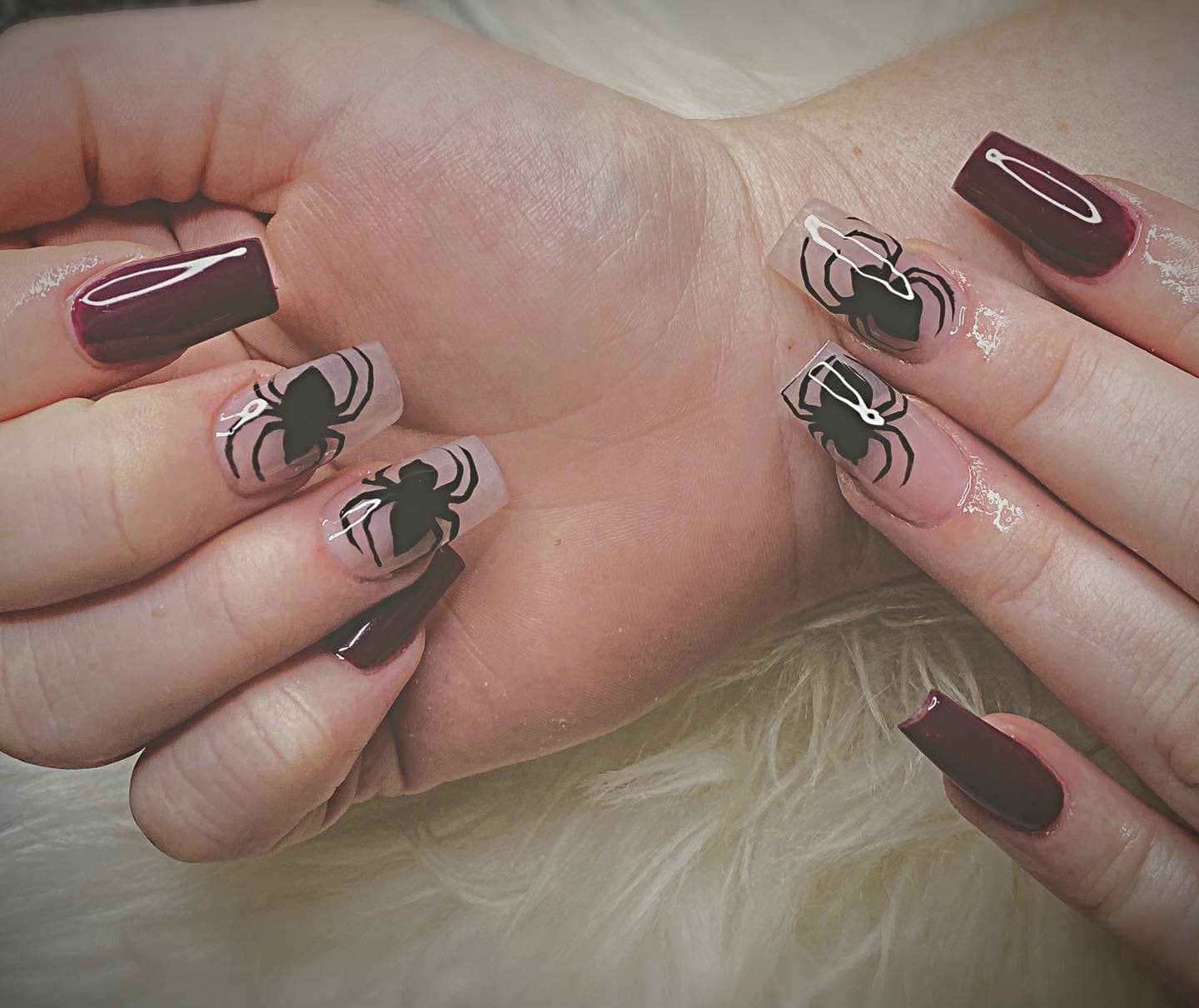 Изображение наносится на один из ногтей. А что изобразить, решать вам. Мы предлагаем несколько описательных примеров для самостоятельного изображения бокала, привлекательных женских губ, черепа и светской дамы на креативном маникюре.