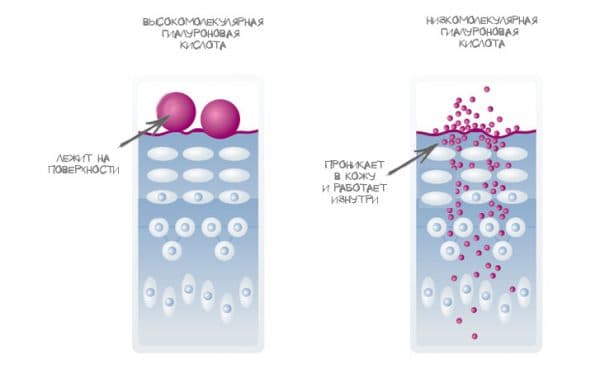 Молекулы гиалуроновой кислоты имеют большой размер и молекулярную массу, и поэтому в норме они не проникают в кожу – глубже чем щели между омертвевшими клетками эпидермиса. Поэтому некоторые производители в составе своих кремов и сывороток используют низкомолекулярную гиалуроновую кислоту, которая была искусственно уменьшена до размеров, которые позволяют ей хорошо проникать сквозь кожу.
