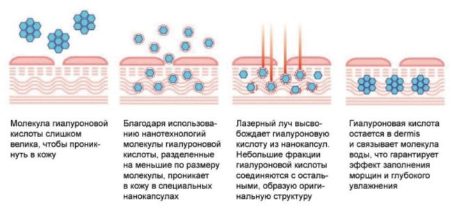 Существуют и низкомолекулярные средства на основе синтезированной гиалуроновой кислоты. Такие используются в аппаратной и инъекционной косметологии. Их молекулы уже настолько малы, что могут при помощи электрических микротоков или, скажем, лазерного луча точечно проникать в глубинные кожные слои, связываться там с молекулами воды, создавая плацдарм для подготовки клеток организма к выработке собственного коллагена. В результате наблюдается эффект лифтинга: мимические морщины заполняются изнутри, уменьшается их глубина, они становятся менее выраженными.