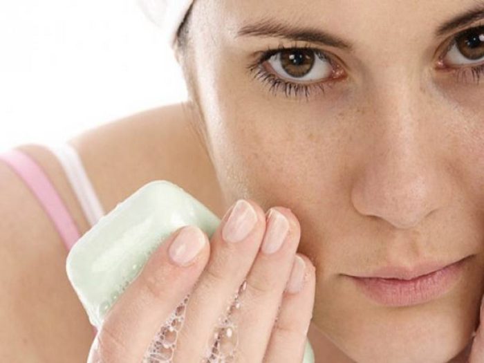 - Очищайте кожу мягким мылом два раза в день. Избегайте средств, которые содержат парабены и вредные красители. Они сушат тело и делают пятна темнее. После умывания хорошо ополаскивайте кожу.