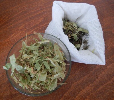 Мешочек из ткани заполните сухим липовым цветом и травой мяты перечной (или полевой) из расчета 1 ст. л. смеси на 1 стакан воды.
