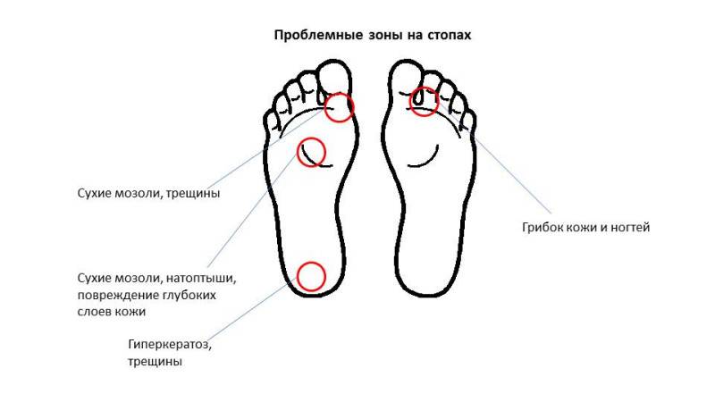 Есть и еще одна особенность состояния кожи стоп при сахарном диабете — гиперкератоз, или избыточное утолщение рогового слоя кожи стопы, что приводит к образованию мозолей, натоптышей и жесткой “корки” на пятках.