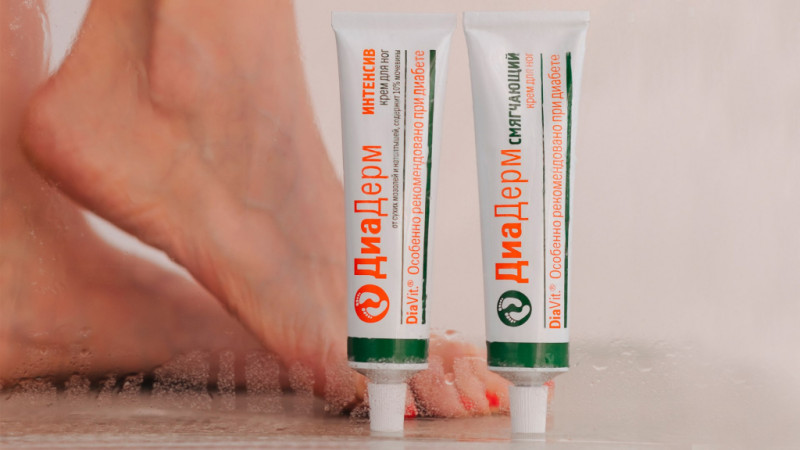 Есть специальные средства для ухода за кожей ног при сахарном диабете. В составах кремов не должно быть опасных компонентов, веществ, которые могут усугубить сухость кожи или вызвать ее раздражение. Этим требованиям отвечает крем для ног Смягчающий “ДиаДерм”: он подходит для ежедневного ухода за кожей ног при сахарном диабете. Крем содержит влагоудерживающий комплекс — мочевину, аллантоин и глицерин, что позволяет интенсивно смягчать и увлажнять кожу, уменьшить гиперкератоз. В составе крема комплекс масел, который препятствует потере влаги, а также антибактериальный комплекс, защищающий кожу от бактериальной инфекции. Такой крем можно применять по всей длине ног.