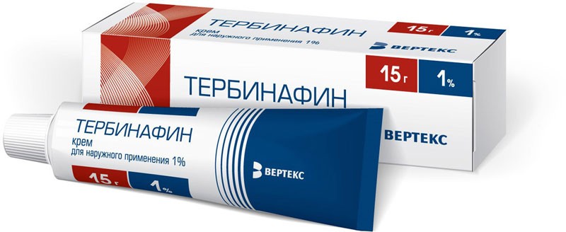 Мазь белого цвета. Объем тубы: 15 г. Активное вещество: гидрохлорид тербинафина. Активно воздействует на все виды грибка. Возрастные ограничения: 3 года. То есть лекарственную мазь можно использовать пациентам практически любого возраста. Останавливает рост и размножение бактерий, затем разрушает их оболочку. Устраняет заболевание через 4-5 недель. Наносить рекомендуется 2 раза в день.