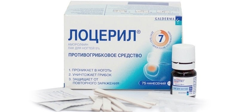 - Лоцерил: рекомендован для лечения ногтей при разных типах грибка, но только при небольшом поражении, а также применяется в профилактических целях. Курс лечения – от 9 до 12 месяцев.