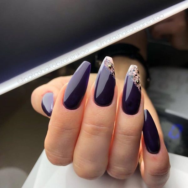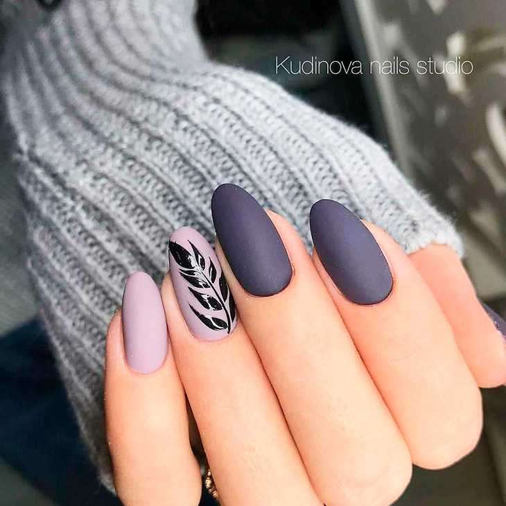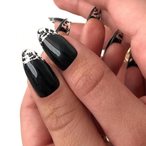 Тёмные оттенки для овальных ногтей выигрышны на длине «стилет» и умеренной. На короткий маникюр больше подойдут классические сочетания, по типу чёрно-белого или френча. Тёмные цвета визуально «срезают» ногтевые пластины, укорачивая пальцы.