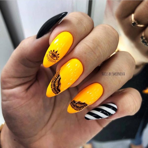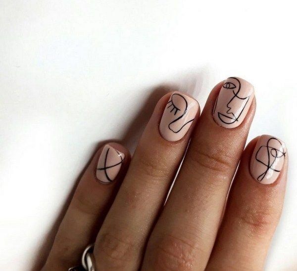 Eye see you. Этот интересный дизайн появился в списке трендов сравнительно недавно. Но очень быстро он стал невероятно популярным. Силуэты, лица и губы, прорисованные в минималистичном стиле, быстро снискали популярность у молодых модниц. Чуть позже к этому нейл-дизайну стали прибегать и дамы постарше