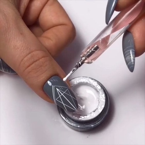 - Геометрическое нанесение. При такой технике оформления на ноготь ставят кляксу геля-паутинки в виде закрепляющей точки, а из нее распределяют нити во все стороны. Движения из точки к точке должны быть быстрыми и четкими, чтобы линии получились ровными и не провисали. Включив воображение, можно создать немало вариантов красивого оформления.