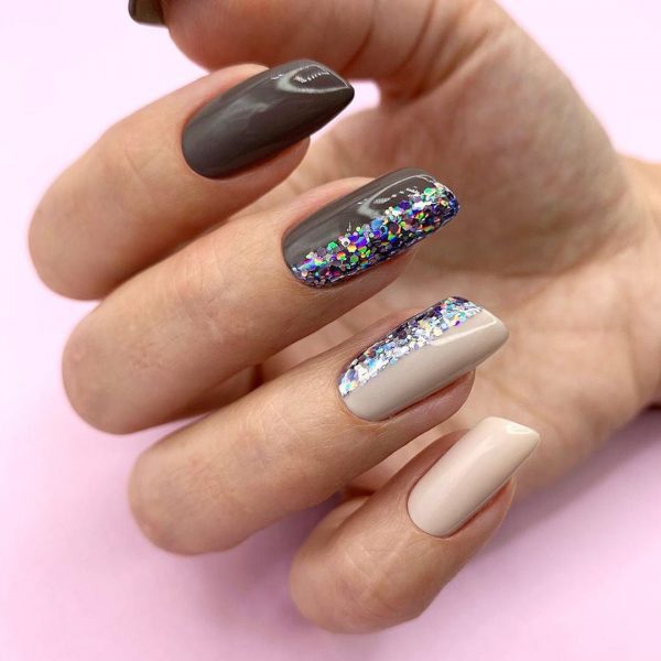 Всегда в тренде, за счет своей универсальности. Дизайн ногтей округлой формы может быть любым. Очень часто для оформления используются лаки с глянцевым и матовым эффектом. Комбинируя их можно получить красивый результат. Также для дизайна применяют блестки мелкого помола, акриловую пудру, бархатный песок.
