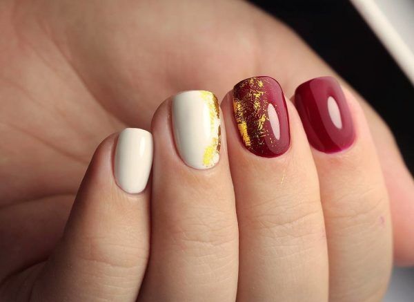 Фольга. Золотая и серебряная фольга тоже вполне подойдет для оформления маникюра на короткие ногти. Причем она отлично будет сочетаться и с пастельными оттенками, и с более броскими. Вообще, дизайн с фольгой получается очень интересным, особенно если его выполнит умелый мастер. Выложенные нарочито небрежно блестящие кусочки фольги — последний писк моды.