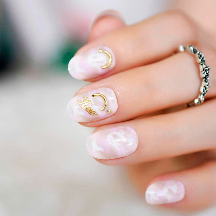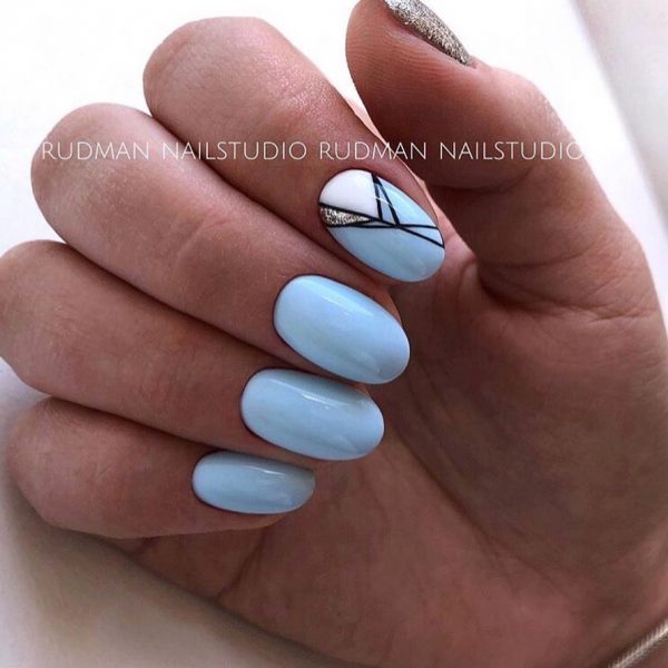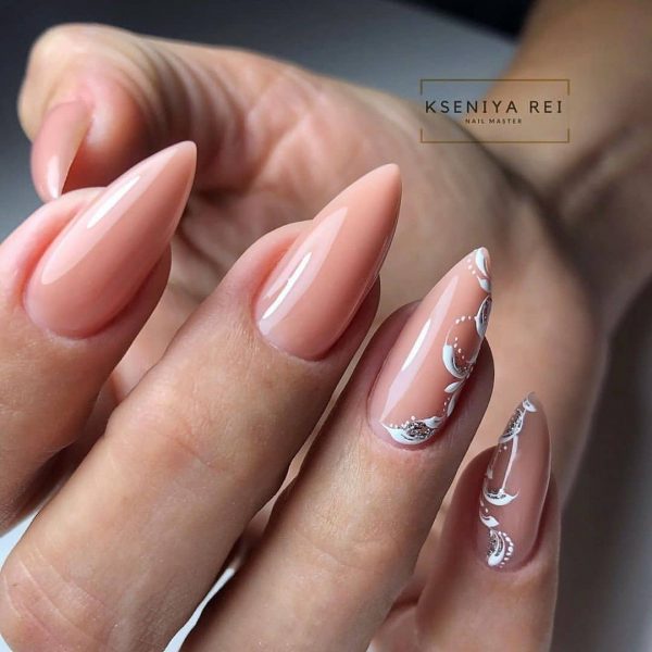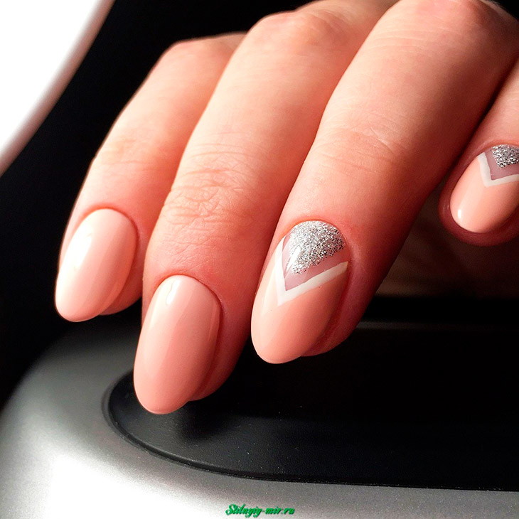 Хороший и интересный выбор дизайна для повседневной и долгой носки. Овальный светлый маникюр будет прекрасно дополнять как простые джинсы, так вечернее платье. Это хороший вариант для тех, кто не хочет «заморачиваться», поскольку в светлых тонах не так заметны отросшие ногти.