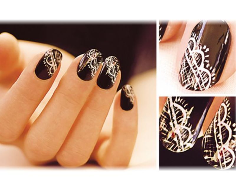 Можно воспользоваться и другим способом — нарисовать кружева своими руками. Прежде чем начать рисовать узор на ногтях, продумайте каким он будет и нарисуйте его на бумаге. Затем возьмите тонкую кисть и акриловые краски и перерисуйте узор на покрытый лаком ноготь. Этот способ хорош тем, что вы можете сами варьировать размер узора.