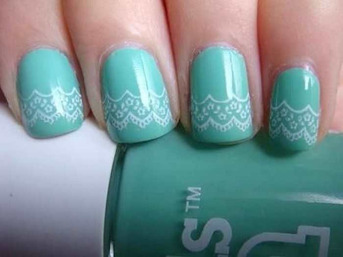 Нежный мятный маникюр с кружевом