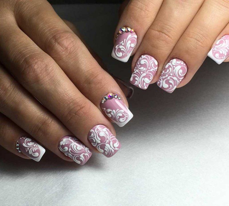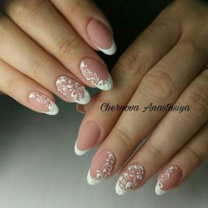 Невесты всегда выбирают нежный и красивый маникюр. Ведь все знают, что это будет видно на фото и видео. Поэтому выбор маникюра с кружевом — отличный вариант. Такой дизайн обычно выполняется в светлых тонах. И чаще всего сочетается с французским маникюром. Для красивого эффекта мерцания можно добавить стразы. Они дополнят маникюр и добавят солнечных бликов.