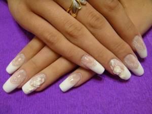 Когда ногти подготовлены, на них наносится прозрачный лак или основа. Ей нужно тщательно просохнуть. Желательно естественным путем. После этого все ногти перекрывают белым лаком. Пока он сохнет, из кружева вырезаются отдельные кусочки, форма и размер которых совпадает с формой и размером каждого ноготка. Работа кропотливая, но достаточно простая.