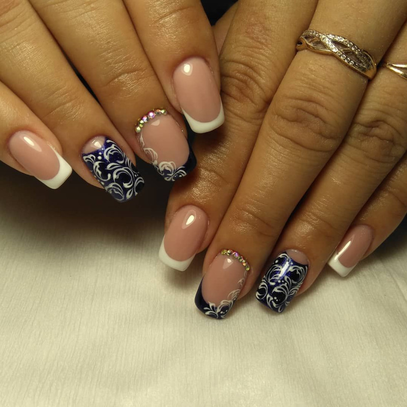Самое распространенное исполнение данного маникюра – основа белого или розового цвета, с наличием легкого ненавязчивого рисунка. Это действительно классика. Орнамент может быть расположен в центре ногтевой пластины, по ее краю или у основания.