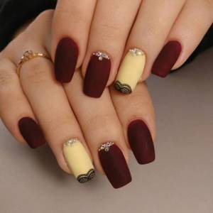 Также не стесняйтесь выбирать яркие цвета лака или геля. Ваша лепнина на таком покрытии может иметь красочный дизайн. Часто в таком варианте безымянный палец выделяется стразами или камнями.