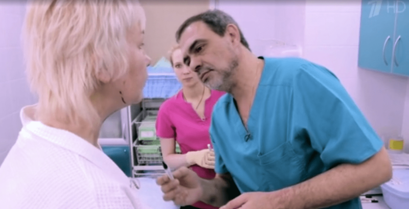 Хирург решил сделать Стриж подтяжку лица с применением SMAS-техники, позволяющей убрать глубокие носогубные складки и «провисающие» щеки, аплатизмопластику – коррекцию второго подбородка, а также «поправил» пациентке верхнее веко.