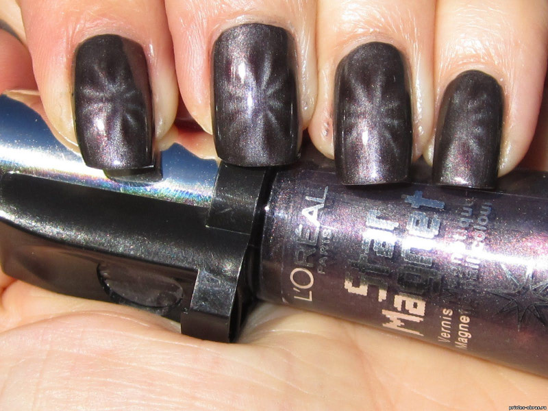 Магнитный лак содержит в своем составе мельчайшую металлическую стружку. При нанесении необходимо поднести к еще не засохшему лаку магнитную крышечку флакона на несколько секунд и лак приобретет необычную форму или узор.