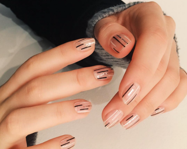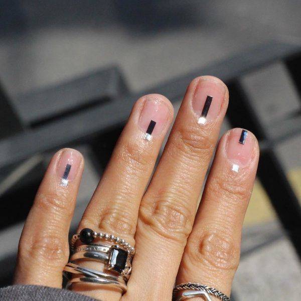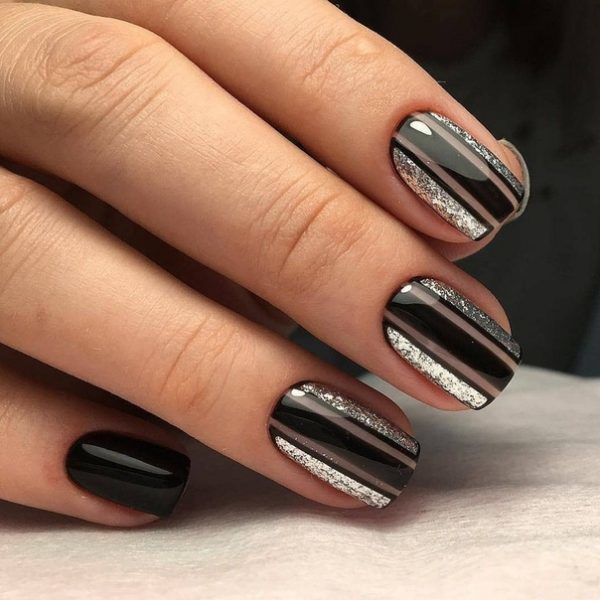 Простая и сдержанная геометрия прекрасно подойдет для создания стильного, но в то же время не броского нейл-арта. Если с умом подойти к выбору дизайна, то можно зрительно сузить и удлинить ногтевую пластину. С этой ролью отлично справится принт в виде тонких вертикальных полос контрастного цвета. Не менее интересно будет выглядеть дизайн, созданный с использованием блестящих золотых или серебряных декоративных элементов.