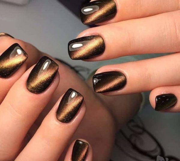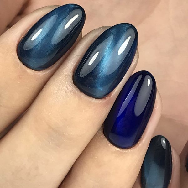 Подкорректировать пластину можно и с помощью темного покрытия с добавлением шиммера. Создавая эффект, подобный «кошачьему глазу».