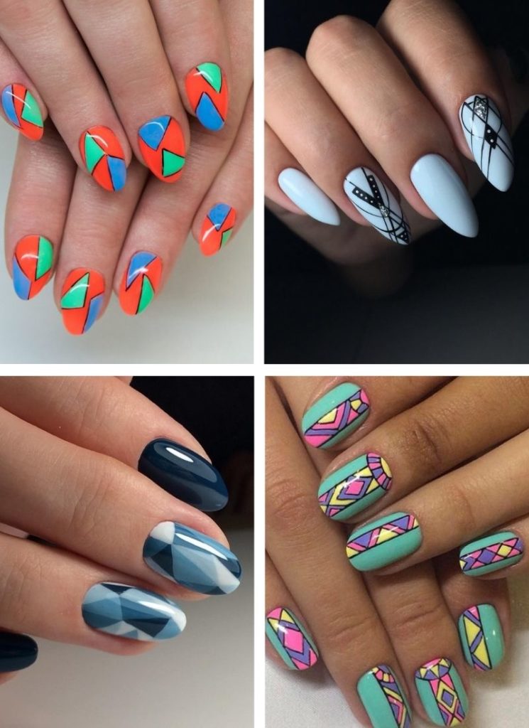 - геометрическая тематика. Оформление ногтей в геометрическом стиле позволит разнообразить однотипный бежевый или пастельный цвет. Кроме того, геометрия выбивается вперёд в трендах 2023-2024 годов и является лидирующей. Её применяют везде: в офисных и деловых, а также ярких и подростковых стилях. Оригинально смотрится геометрическое глянцевое покрытие на нюдовом основании ногтя. Это позволяет создать необычный образ, который придётся по душе каждой моднице. Плюсом такого оформления является то, что геометрию можно наносить на любую основу;