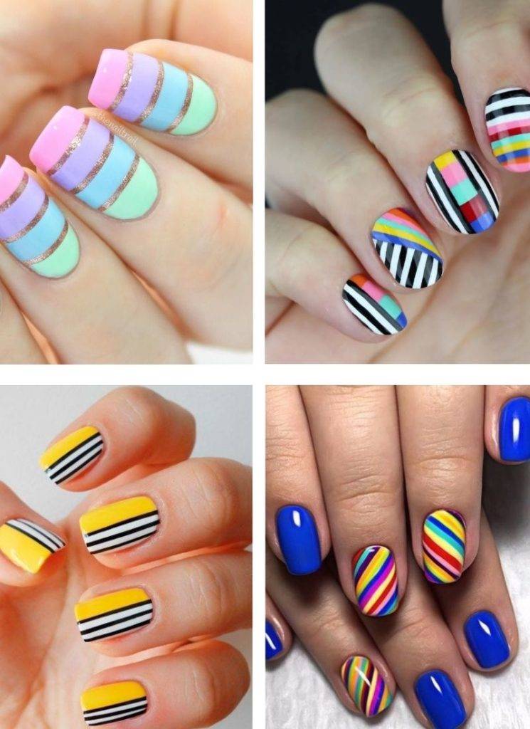 Полосатые маникюры обещают стать трендом текущего года. Можно расположить линии по горизонтали, вертикали, диагонали, чередуя цвета, а также менять их ширину. Ограничений нет, допустимы все творческие эксперименты.