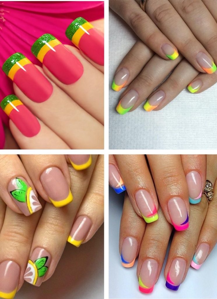 На сезон весна-лето в маникюре тренды задают яркие цвета. Френч тоже не останется без таких акцентов. Кончики ногтей в полоску или в оттенках фуксии, лайма, небесного синего, любые нестандартные сочетания цветов сегодня актуальны. Можно смело решаться на эксперименты.