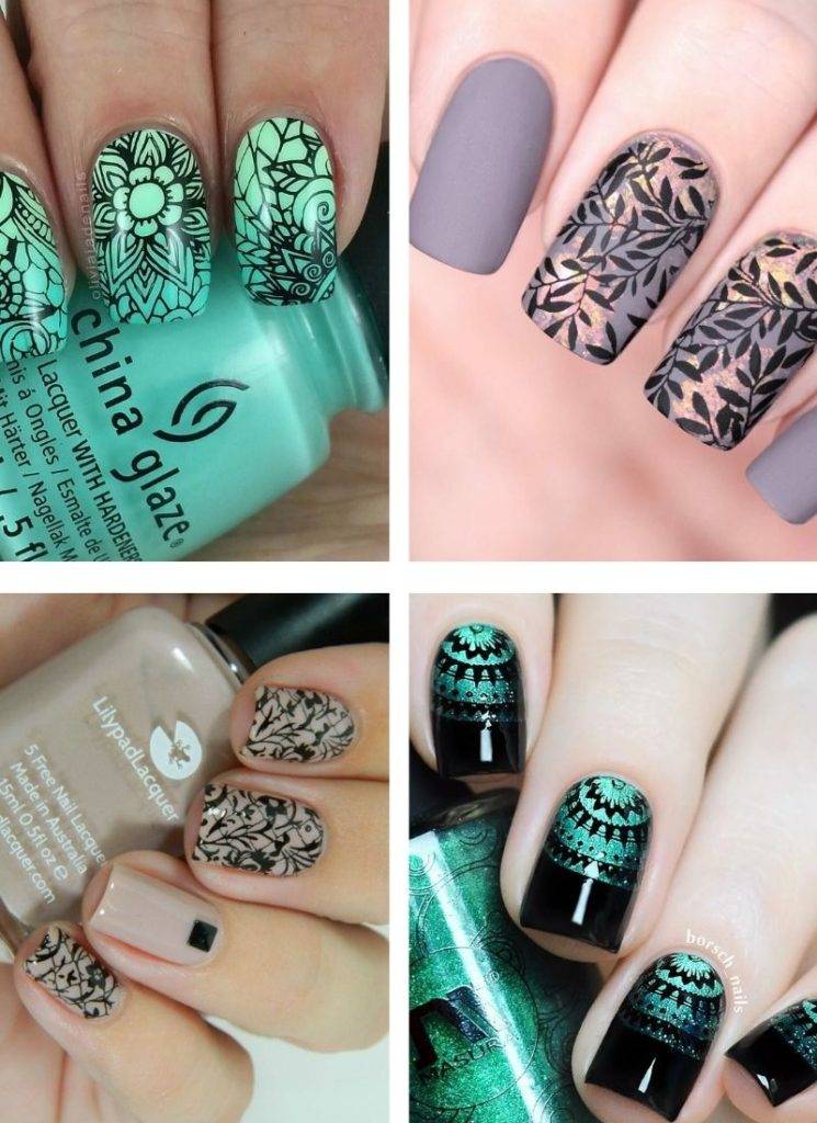 Коричневые и зелено-желтые цвета опавшей листвы и оголенной земли – еще один яркий осенний тренд. На таком фоне хорошо смотрится и стемпинг, и рисунки. Главное – выдержать гамму тонов.