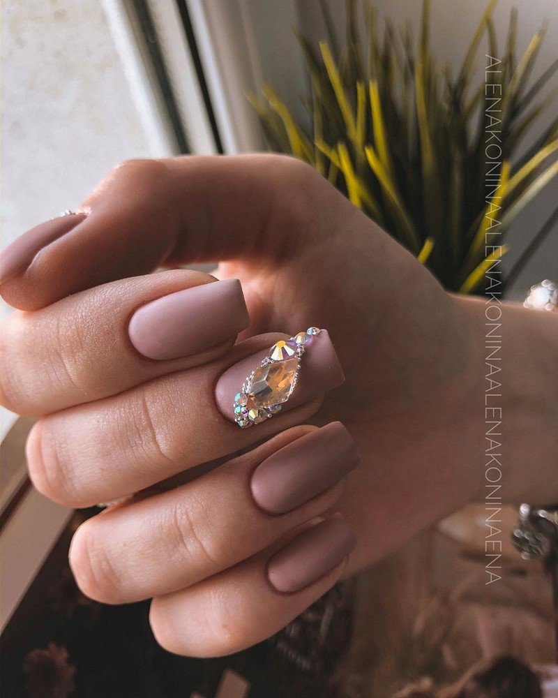 Тенденция выделения одного ногтя прижилась и в других видах модного маникюра 2021-2022. Речь идет о маникюре со стразами и рисунками, французском, лунном, матовом маникюре.