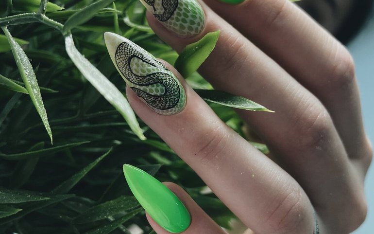 Интересный тренд для любительниц необычного маникюра. Под шкуру питона можно оформить только 1 акцентный ноготь или все сразу.