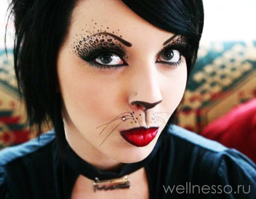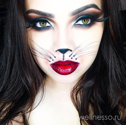 Для создания праздничного образа достаточно сделать выразительный make up со стрелками, использовать яркую помаду ну и нарисовать усики. А если хочется еще больше походить на пушистое очарование, то можно использовать специальные линзы с вытянутыми зрачками.