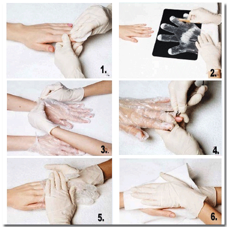 - Затем снимаются перчатки и втираются остатки крема, легкими массажными движениями в кожу.