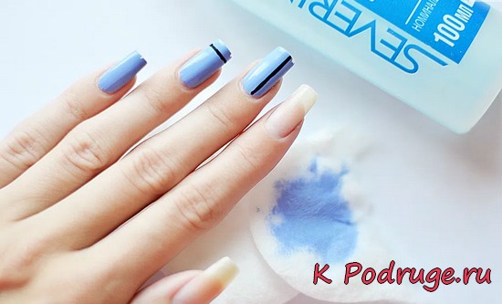 - Снимите старый лак. Специальная жидкость также обезжирит поверхность ногтевой пластины.