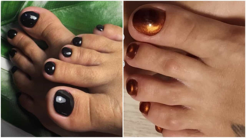 Темный оттенок лака особенно хорошо будет смотреться на закругленном педикюре. Интересно выглядит на таких пластинах техника «кошачий глаз».