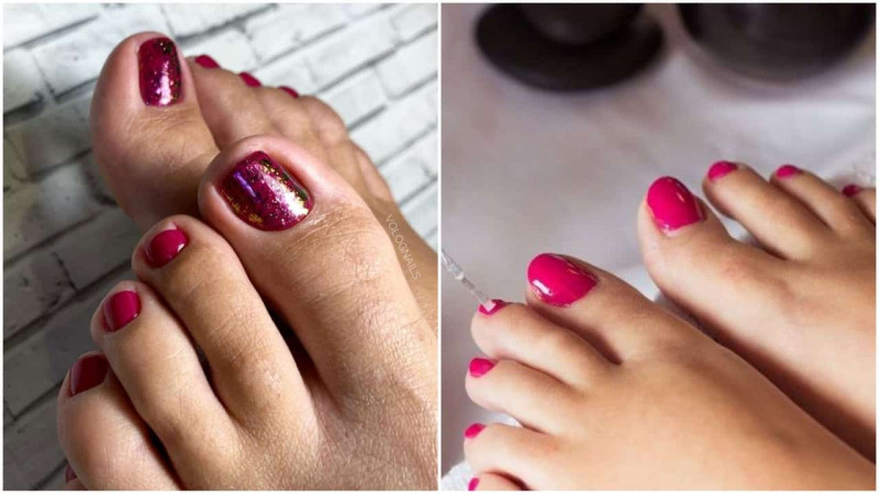 Малиновый педикюр на овальных ногтях