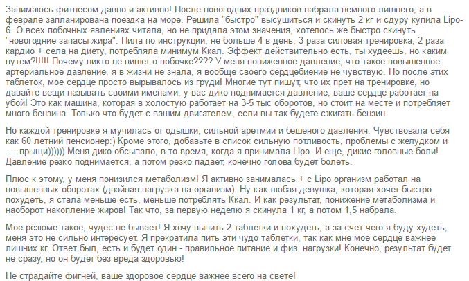 - Татьяна – 43 года – пишет: «Не могу сказать, что эффекта от приема не было вообще – выдерживала час кардио в быстром темпе. После тренировок вся мокрая была. Соблюдала режим питания, добросовестно тренировалась, но совсем ничего не сбросила».