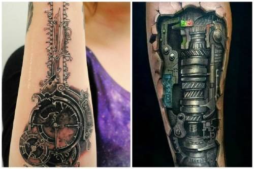 - Один из излюбленных участков на теле для нанесения татуировки биомеханика– предплечье. Этот участок первым бросается в глаза, но его также быстро можно скрыть под одеждой. Из-за постоянного движения руки изображение приобретает динамичность. Ограничений для нанесения наколки на эту часть тела нет, все зависит лишь от фантазии и воображения будущего обладателя.