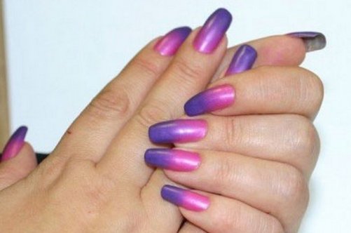 Эти лаки сейчас на вершине популярности среди модниц, ведь они обладают уникальной особенностью изменения цвета исходя из температуры! Такой дизайн выглядит действительно фантастически, как и сама технология его создания. Лак термоактивен, он меняет свой цвет интенсивно и быстро. В итоге создается стильный эффект омбре – плавный переход одного цвета в другой. Идеально такой нейл-дизайн выглядит на ногтях длинных или хотя бы средней длины. Так оттенки существенно отличаются друг от друга, создавая абсолютно неподражаемый и особенный внешний вид ваших ручек.