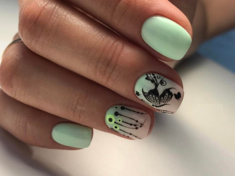 Дополнением к зелени могут стать серый либо нежно-жёлтый цвет. С их помощью можно создать настоящий модный образ. Такое цветовое сочетание будет смотреться восхитительно как на длинных, так и на ногтях средней длины.