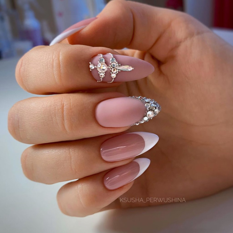 Ещё один вариант французского маникюра с крупными стразами и градиентом.