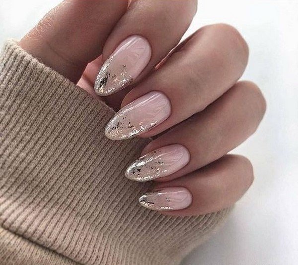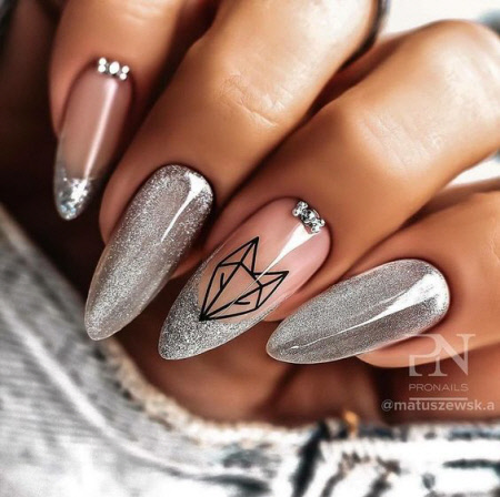 Стильный маникюр на осень 2021 мастера нейл-арта предлагают выполнить серебряным лаком. Нет, это не глиттер и не блестки. Это серый гель-лак, в составе которого имеется мельчайшая мерцающая крошка. Такие ноготки элегантно переливаются на солнце, а при искусственном освещении выглядят дорого, но не броско, как металлическая втирка для ногтей.