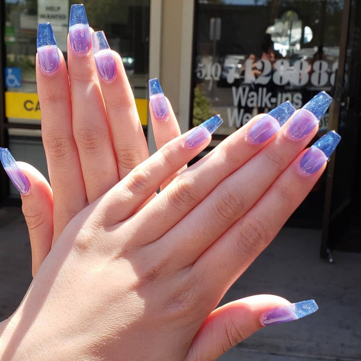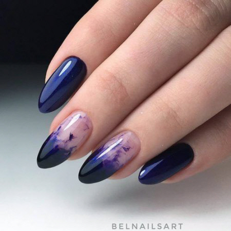 Главный цвет 2021 года продолжает оставаться актуальным и в маникюре. Классический синий оттенок лака для длинных ногтей используется в качество второстепенного для дизайна. Длинные синие ногти выглядят слишком вызывающе. В этом сезоне стилисты рекомендуют обладательницам шикарных длинных ногтей остановить выбор на нюдовой палитре или френче.
