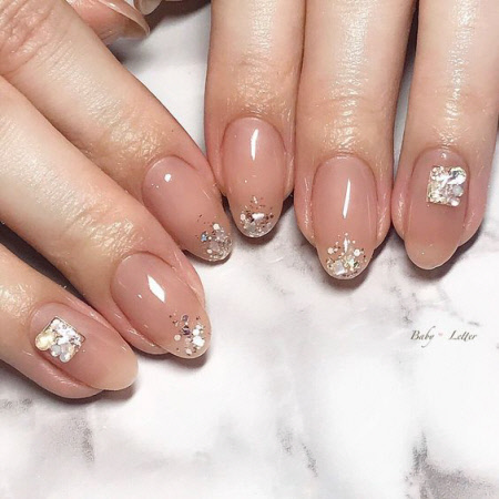 Ещё один вариант французского маникюра с крупными стразами и градиентом.