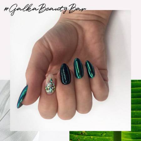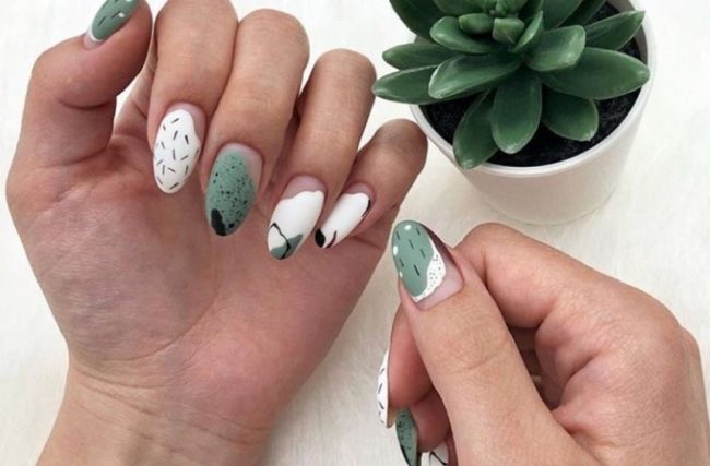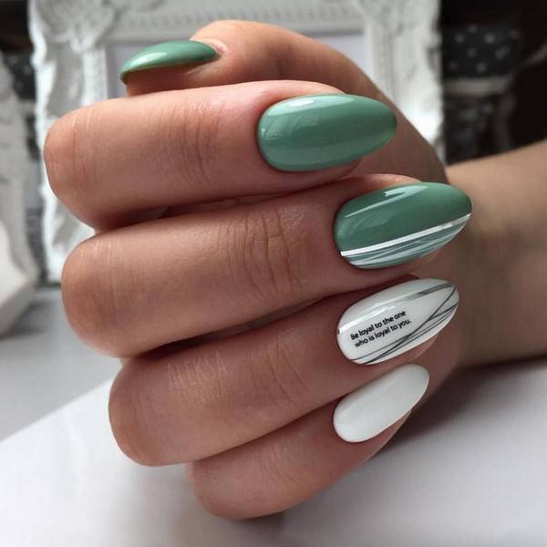 Дополнением к зелени могут стать серый либо нежно-жёлтый цвет. С их помощью можно создать настоящий модный образ. Такое цветовое сочетание будет смотреться восхитительно как на длинных, так и на ногтях средней длины.