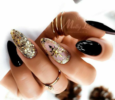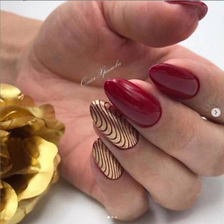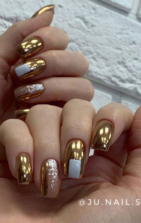 Богатый золотой цвет чаще всего используют в качестве декора или украшения какого-либо рисунка на ноготках. Также популярностью пользуются золотые стразы, полоски, камни, камифубуки и блестки.