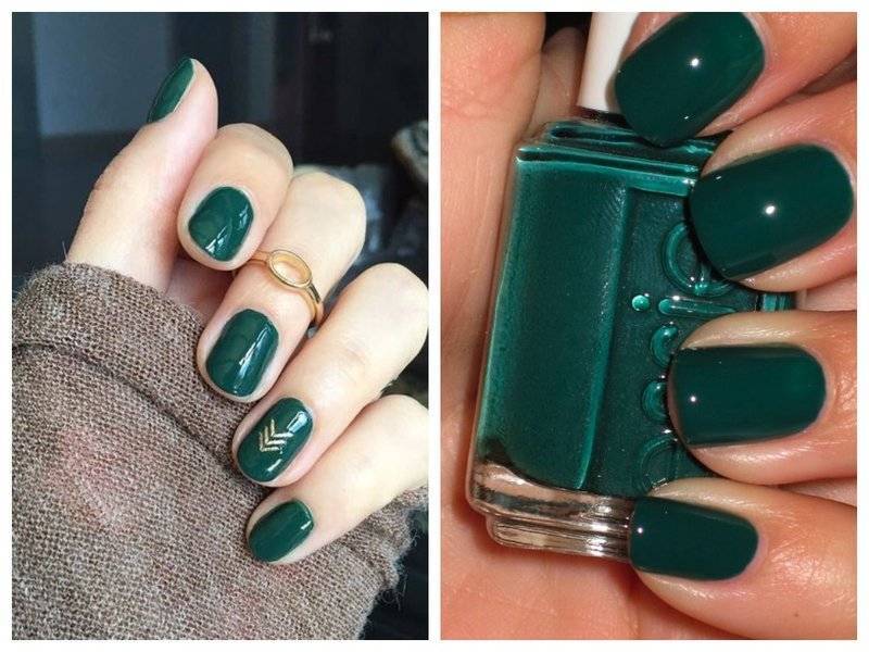 Еще один идеальный оттенок гель-лака для коротких ногтей на осень — ультрамариновый зеленый. Его мастера ногтевого сервиса рекомендуют комбинировать с черным, серым и желтым. Отличная идея для простого дизайна — матовый топ. С ним ноготочки обретают бархатистость, а благодаря темному оттенку не так подвержены загрязнению, как белые матовые ногти.