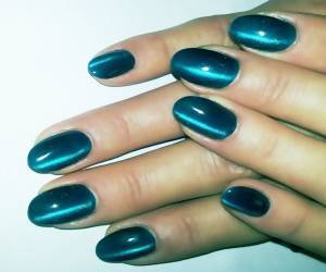 Сначала ноготки покрывают основой (базой) для гель-лака, которую просушивают в ультрафиолетовой лампе. Затем наносят зеленый гель-лак, который тоже сушат. Магнит подносить сразу не нужно. В видео мастер этот момент описывает. На фото показан прекрасный, глубокий изумрудный оттенок, который очень похож на кошачий глаз.