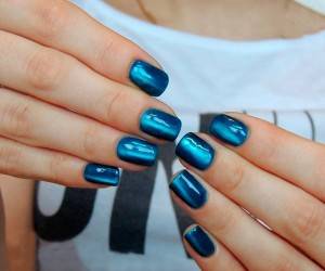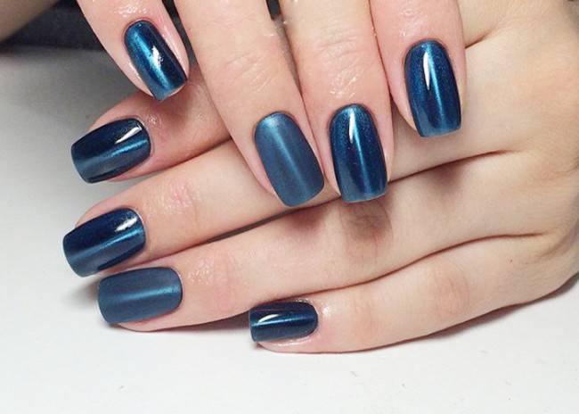 На фото приведен пример именно классического маникюра в этом стиле. Специальный магнит распределяет металлические частички так, что образуется интересный оттенок из одного базового цвета. Добиться такого же эффекта без магнита невозможно.