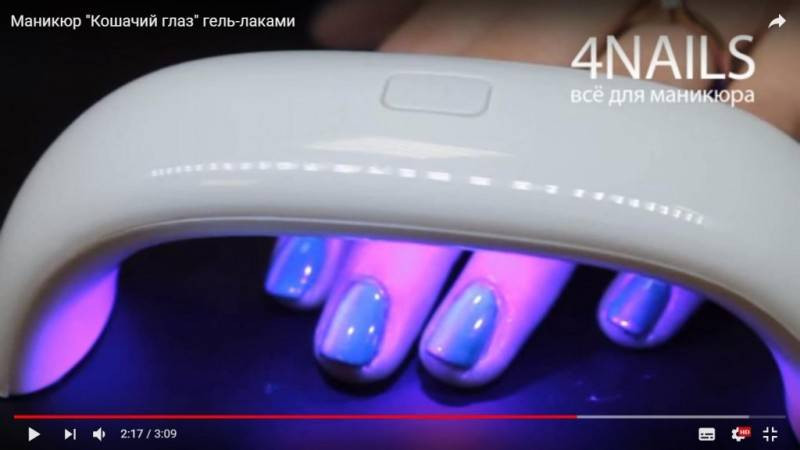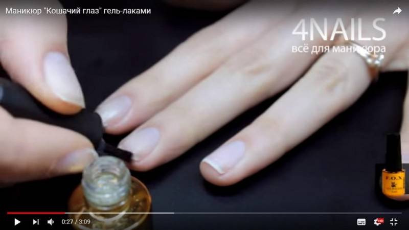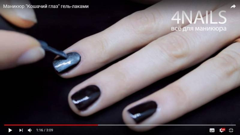В видео мастер показывает самый простой способ создания дизайна при помощи магнита. Конечно, это не считается классическим кошачьим взглядом, скорее домашней разновидностью.